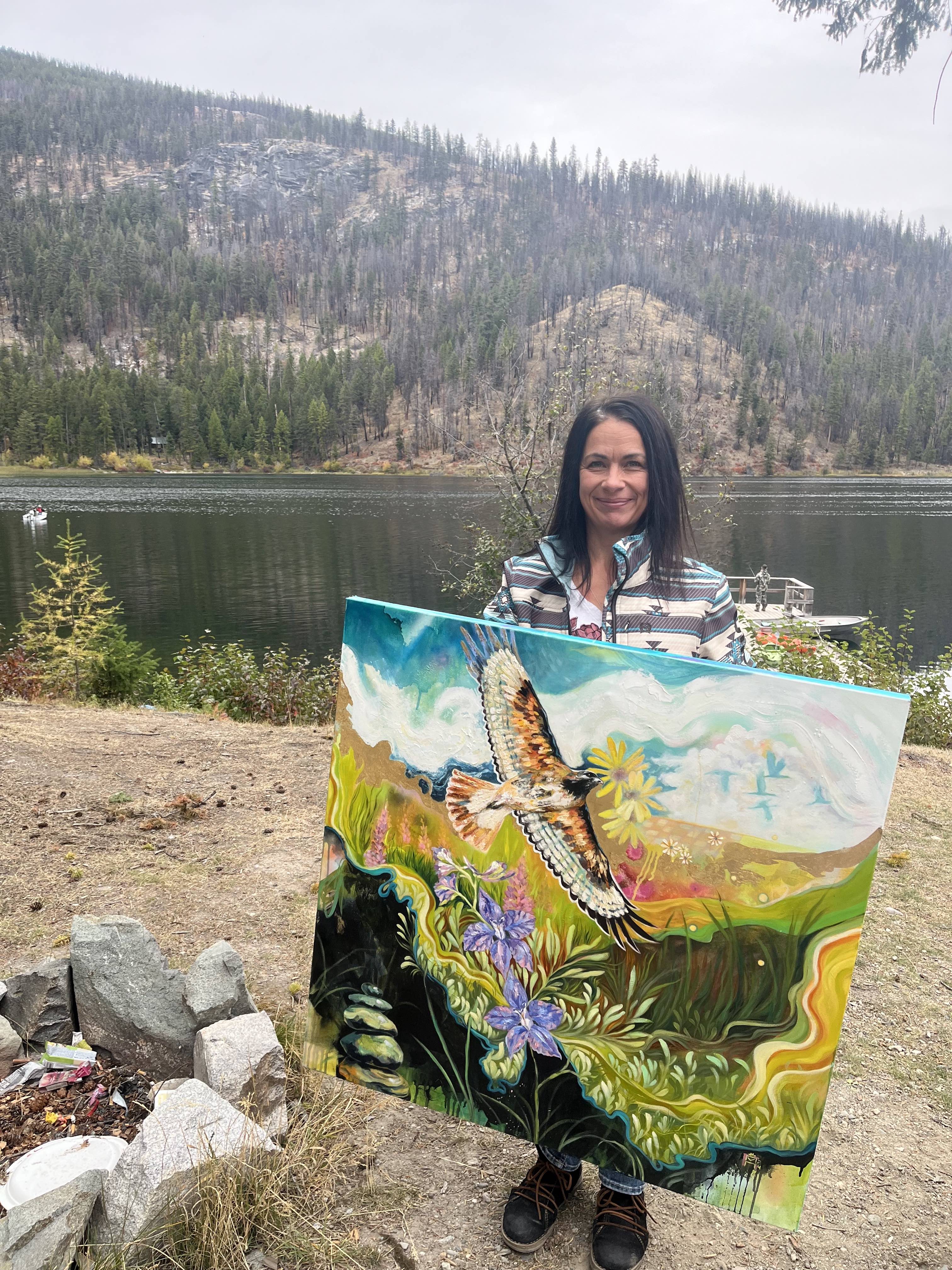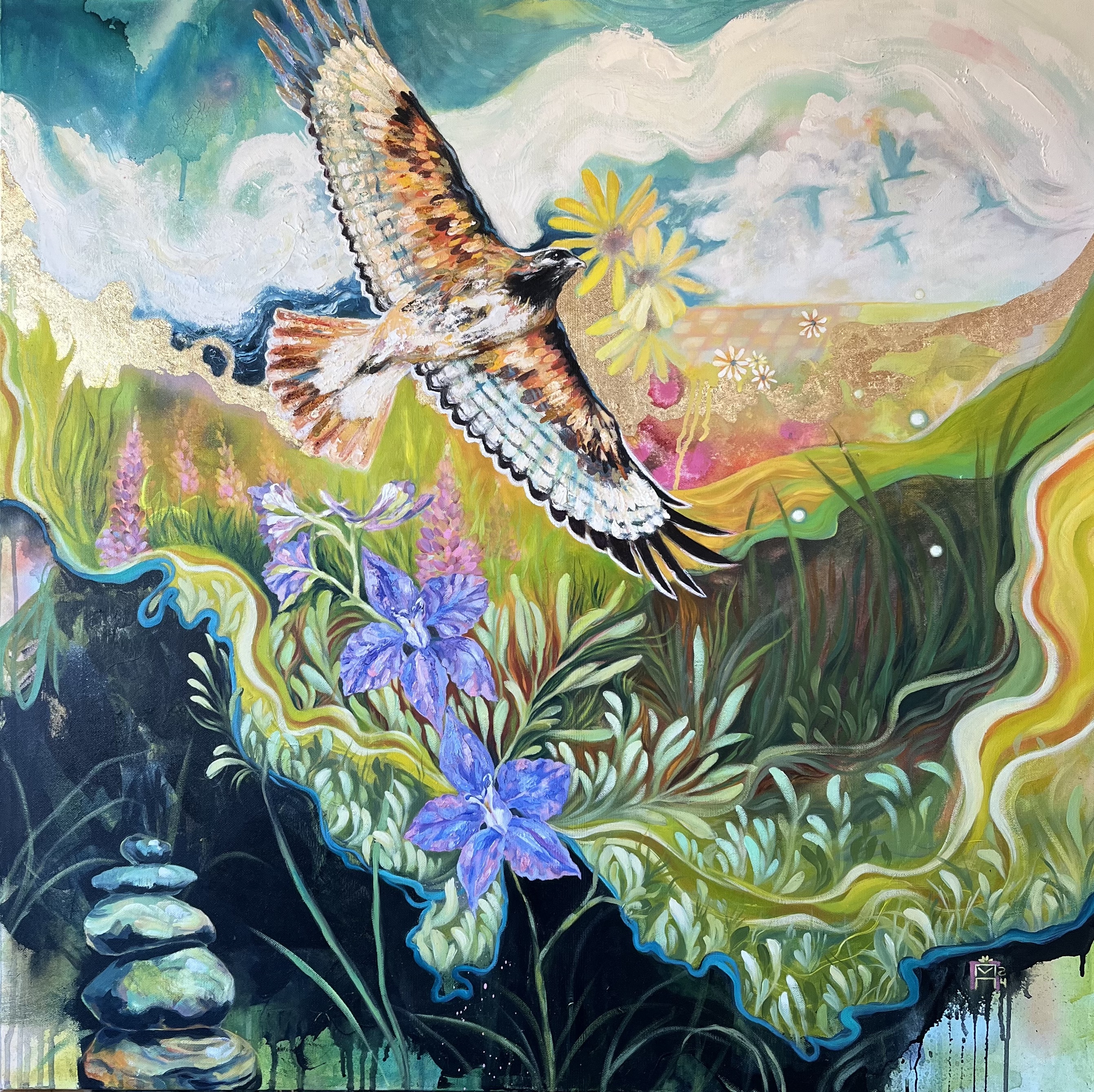 Heather’s words: “It began with self care and fixing up my little private space for continued healing in my health and spirit. I wanted a picture of the Red Tail Hawk. It has always been a totem for me. I was looking for a cheap print online. Then I met Meg and have seen the depth in her work. I knew it was meant to be. I approached her and asked her if she did commission pieces. And. so it began. Little did I know the further hardships I’d face that summer with bombshell, heart shattering truth, and fighting once again for my health. This journey of my spirit and vessel has not been easy for me. It has broken me, fixed me, hardened me, and softened me and molded me into who I am and who I am supposed to be. It hurts, and it’s hard, but it’s wonderfully beautiful and amazing too. Now that my special painting is in it’s home, the freeness that this picture makes me feel is enlightening and uplifting. The mystery captures my spirit and personality. The strength and courage is revealed, and I’m learning to embrace and love myself and truly appreciate who I am, and how strong my vessel and soul really is. Looking at this daily gives me peace and inspiration, and puts me in a positive place. I can hear it and feel it. Thank you, Meg!